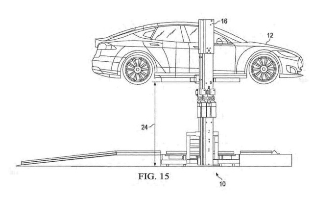 新專利文件包含了52頁草圖,它詳細介紹了系統(tǒng)的運行原理,系統(tǒng)包括一套2柱式車輛提升機和相應的電池提升機。
