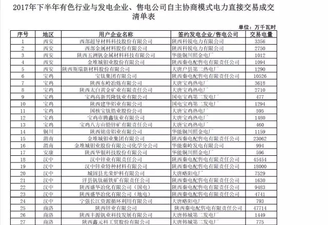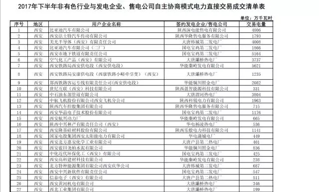 關(guān)于陜西省2017年下半年自主協(xié)商模式電力直接交易成交結(jié)果