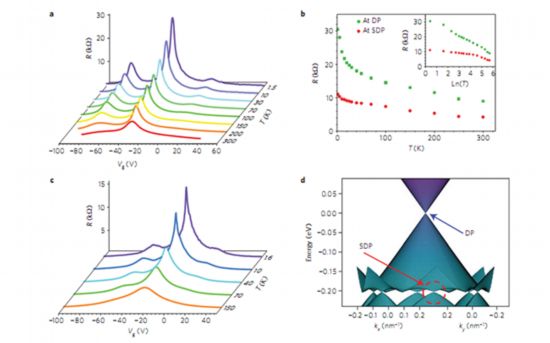 圖3:石墨烯/六方氮化硼的電學(xué)輸運(yùn)隨溫度的變化曲線,超晶格狄拉克點(diǎn)的出現(xiàn)以及相應(yīng)的能帶結(jié)構(gòu)。