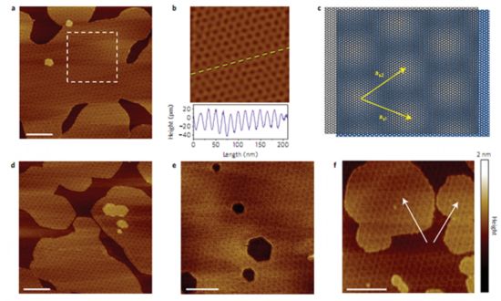 圖2:通過AFM表征可以清晰地在各種不同生長階段的樣品觀測到~15nm的石墨烯二維超晶格結(jié)構(gòu)。