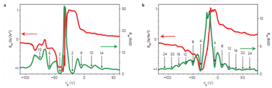 圖4:單層和雙層石墨烯的在~1.6K下的量子霍爾輸運(yùn)曲線。