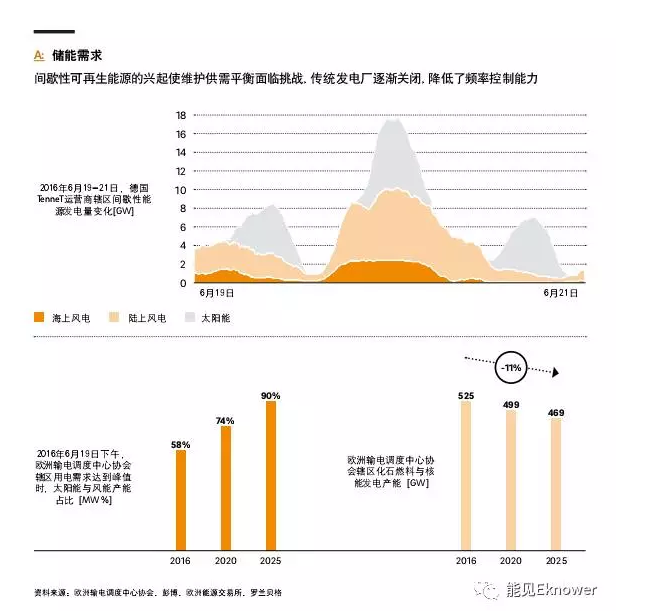 能源轉(zhuǎn)型非常迅速,為解決能源系統(tǒng)中可再生能源的相關(guān)問題,業(yè)內(nèi)亟需相應(yīng)的解決方案。圖A中,歐洲地區(qū)太陽能與風(fēng)能總和到2025年接近需求峰值需求的90%。這說明在絕大多數(shù)時間內(nèi),可再生能源可以滿足全部的能源需求。但當(dāng)可再生能源無法滿足需求時,需要有充足的備用能源作為后補(bǔ)方案,這種備用能源必須具有高度的靈活性,而這正是火力發(fā)電廠所欠缺的重要特征。