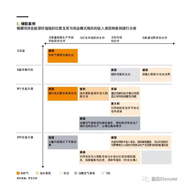 盡管目前市場環(huán)境對于儲能不利,儲能的市場潛力巨大,第一批實驗項目正在進(jìn)行。羅蘭貝格分析了一些案例,并且根據(jù)這些項目在能源價值鏈所處位置以及商業(yè)模式的收入類型對這些案例進(jìn)行了分類總結(jié)。