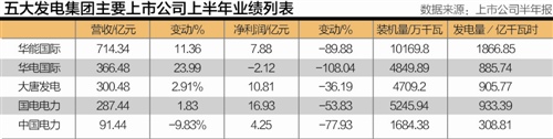 五大發(fā)電集團的主要上市公司,華能國際(600011.SH)、華電國際(600027.SH)、大唐發(fā)電(601991.SH)、國電電力(600795.SH)、中國電力(002380.HK)均出現(xiàn)凈利潤大幅下滑,下滑幅度從36.19%到108.04%不等。其中,華電國際還虧損了2.21億元。