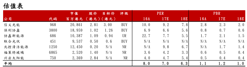 就2017年余下的幾個月及2018年的光伏供應(yīng)鏈而言,招銀國際相信美國貿(mào)易組織于9月22日就光伏201條款公布的初步裁決將是短期關(guān)鍵。結(jié)合中國市場及新興市場的光伏裝機需求分析,招銀國際對全球光伏需求維持強健狀態(tài)保持樂觀。對于港股光伏板塊,基于光伏玻璃市場供需平衡更趨向于供應(yīng)端,招銀國際認為信義光能(00968,買入)將是板塊首選;基于較低的市場估值以及更高的產(chǎn)品銷售均價預(yù)期,保利協(xié)鑫(03800,買入)也是招銀國際的板塊偏好之一。