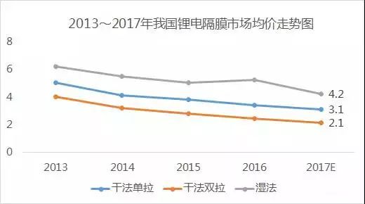 自2013年開始,我國鋰電隔膜材料價格呈現(xiàn)下滑趨勢,截止2016年干法和濕法隔膜材料價格下降均超過35%,然同期聚丙烯價格降幅不超過20%,聚乙烯價格降幅不超過5%。