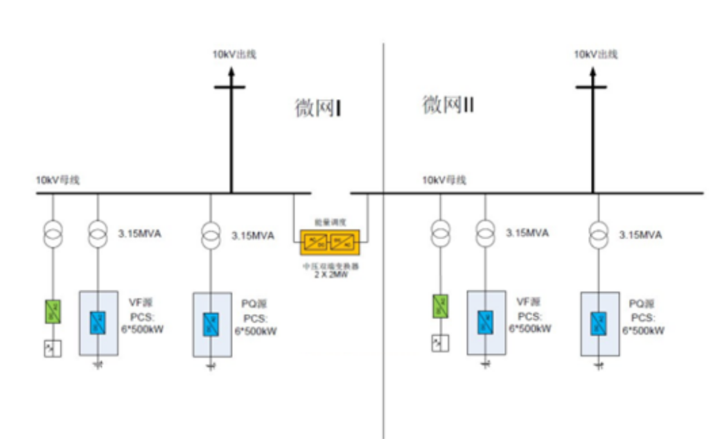 其中,一期項目儲能系統(tǒng)電源容量為9MW,分為兩部分,鋰電池儲能電源功率容量為3MW,鉛炭電池儲能電源功率容量為6MW。其中3MW為系統(tǒng)基礎容量,實現(xiàn)微電網(wǎng)的V/F調(diào)節(jié),6MW作為儲能系統(tǒng)的P/Q源,主要實現(xiàn)對系統(tǒng)的供電,每3MW儲能逆變器交流側(cè)連接后經(jīng)一臺3150kVA/10/0.4升壓變壓器接入開關站子網(wǎng)10kV母線。