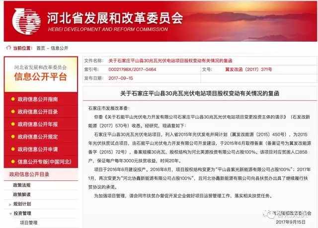 “石家莊平山縣30兆瓦光伏電站項(xiàng)目”(以下簡(jiǎn)稱該項(xiàng)目)為光伏扶貧項(xiàng)目。該項(xiàng)目于2016年6月投產(chǎn),目前涉及股權(quán)變更。下圖為河北省發(fā)改委文件原文: