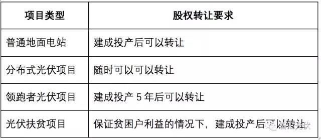 綜上所述,不同類型光伏項(xiàng)目的股權(quán)轉(zhuǎn)讓要求如下: