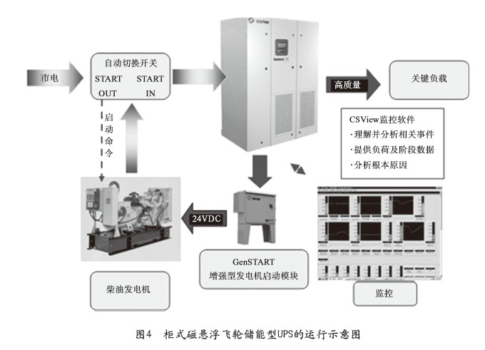 在傳統(tǒng)UPS供電系統(tǒng)中,當(dāng)電力發(fā)生中斷時(shí),蓄電池會(huì)支撐系統(tǒng)正常運(yùn)轉(zhuǎn),與此同時(shí),柴油發(fā)動(dòng)機(jī)開始啟動(dòng),以此保證數(shù)據(jù)中心主機(jī)正常工作、空調(diào)連續(xù)運(yùn)轉(zhuǎn)。蓄電池型UPS在此過程中,提供了“分鐘級(jí)”的電力供電。而飛輪儲(chǔ)能型UPS受制于機(jī)械儲(chǔ)能,僅僅能夠提供30s到1min電力供電,這也是飛輪UPS被詬病的主要原因。然而,專家指出,如今,市電電源的可靠性達(dá)到99.9%,有些重要的負(fù)載都采用雙路市電供電,市電的可靠性可以說已經(jīng)達(dá)到了99.99%。萬一市電中斷,后備電源的可靠性也可以達(dá)到99.9%,從市電到后備電源的切換,在技術(shù)上只需要10s的時(shí)間,這是一個(gè)公開的標(biāo)準(zhǔn)。目前,歐洲已經(jīng)將這個(gè)時(shí)間定了8s。可以斷定,飛輪儲(chǔ)能型UPS能提供30s的電力完全能夠滿足從市電到后備電源的可靠切換的要求。圖4給出了柜式磁懸浮飛輪儲(chǔ)能型UPS的運(yùn)行示意圖。