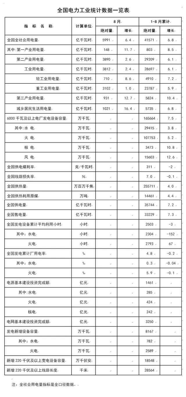 9月21日,國家能源局發(fā)布1-8月份全國電力工業(yè)統(tǒng)計(jì)數(shù)據(jù)。