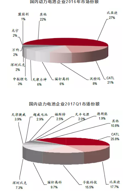在動(dòng)力電池激烈的行業(yè)競(jìng)爭(zhēng)中,CATL、比亞迪等優(yōu)勢(shì)企業(yè)逐漸確立了自己的龍頭地位,行業(yè)集中度不斷提升。2016年與2017年1季度,國內(nèi)動(dòng)力電池前三家企業(yè)合計(jì)出貨量占比超過50%;CATL也逐漸超過比亞迪,成為國內(nèi)動(dòng)力電池龍頭。