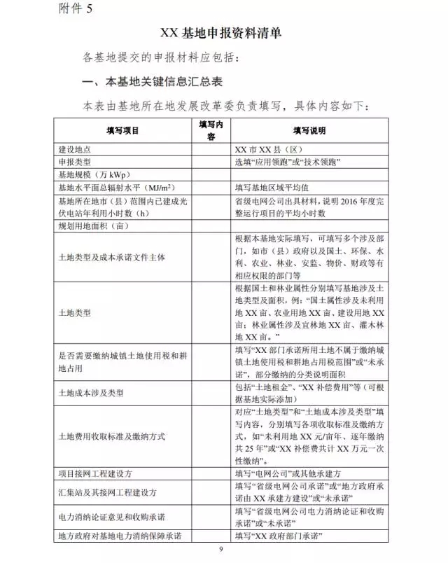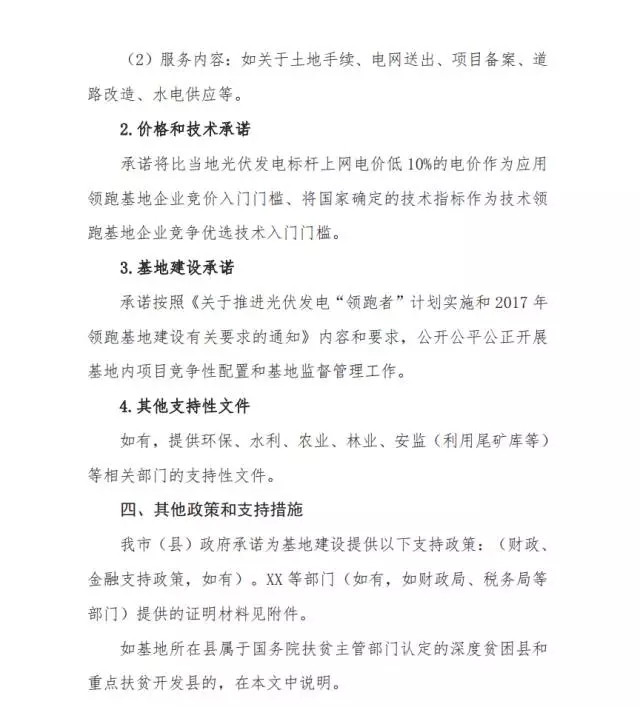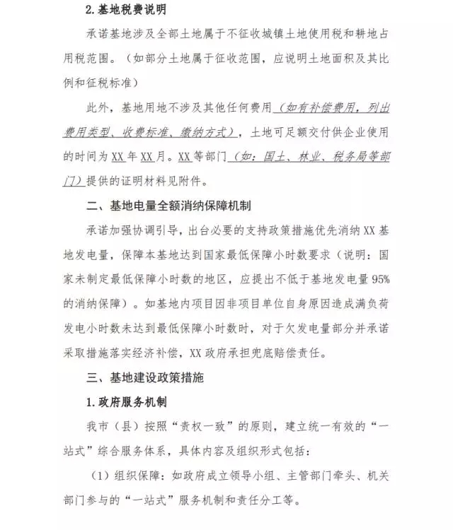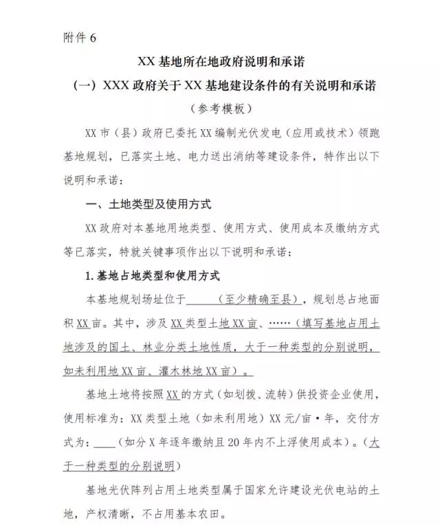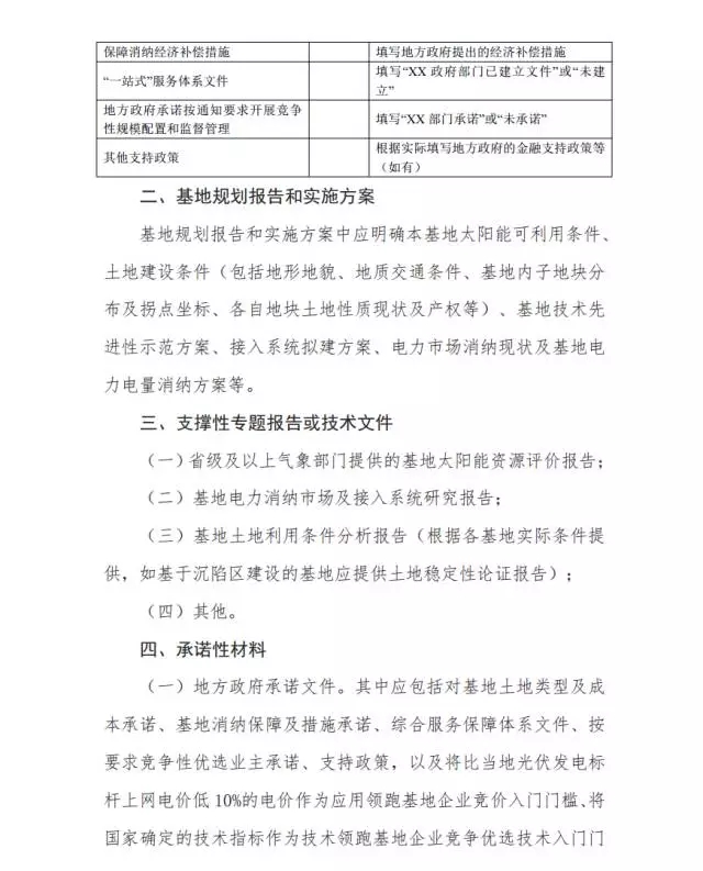(五)地方政府推進工作機制和服務(wù)保障。建立健全基地項目地方政府管理“一站式”服務(wù)體系,簡化項目建設(shè)審批手續(xù),降低企業(yè)開發(fā)光伏電站的非技術(shù)成本,確保公開公平公正進行基地項目競爭性配置并對基地進行嚴格監(jiān)督管理。基地所在地政府應(yīng)公平對待符合條件的所有參與競爭的企業(yè),不得對企業(yè)提出申報基地時已明確的建設(shè)任務(wù)之外的增加企業(yè)負擔(dān)的其他要求。