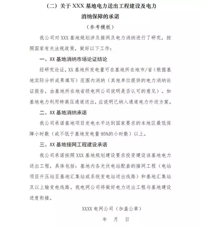 (四)電力市場消納保障?;厮诘厥〖壈l(fā)展改革委(能源局)會同有關(guān)部門提出基地項目電力消納范圍、明確保障基地項目電力優(yōu)先消納的措施?;厮谑〖夒娋W(wǎng)企業(yè)應(yīng)提供基地項目發(fā)電全額消納或達到國家規(guī)定的最低保障小時數(shù)(或限電比例不超過5%)的論證意見及承諾;基地所在地市(縣)政府應(yīng)采取有效措施保障基地電力全額消納,承擔(dān)基地項目因限電達不到國家最低保障小時數(shù)相應(yīng)欠發(fā)電量的經(jīng)濟補償責(zé)任。