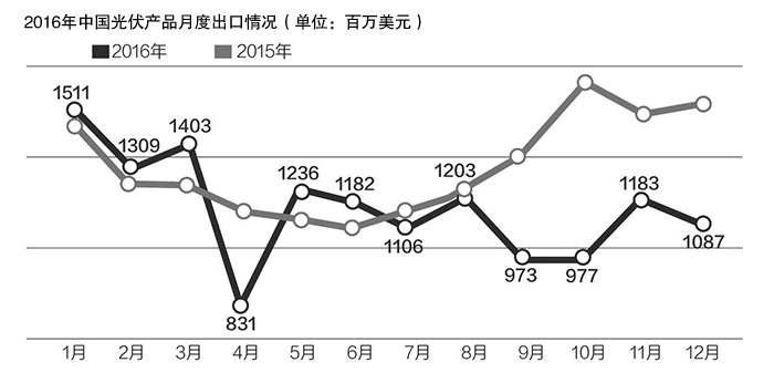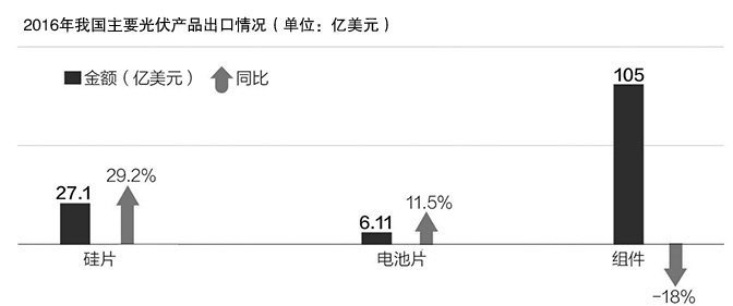 中國光伏協(xié)會公布的數(shù)據(jù)顯示,2016年全年,我國光伏產品出口總額為140億美元,同比下降10.4%。其中,硅片出口額27.1億美元,同比增長29.2%;電池片出口額8.1億美元,同比增長11.5%;組件出口額105億美元,同比下降18%。