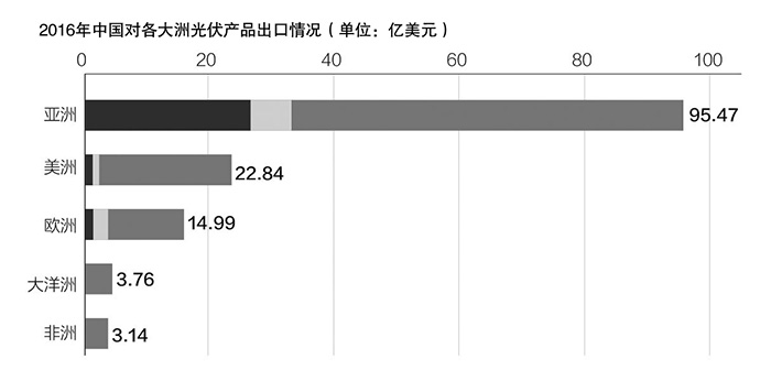 據(jù)統(tǒng)計,2016年,中國硅片、電池片和組件產品出口額約為138.4億美元,同比下降11.3%;對印度、土耳其、智利、巴基斯坦等新興市場出口顯著提升,對歐美傳統(tǒng)市場出口占比下降幅度達到30%。