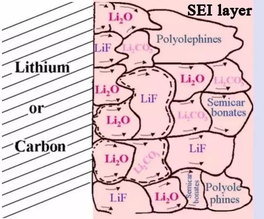 在商業(yè)化鋰離子電池體系中,電池的容量損失部分是來(lái)自于石墨與有機(jī)電解液之間的副反應(yīng),石墨很容易與鋰離子有機(jī)電解液發(fā)生電化學(xué)反應(yīng),特別是溶劑為碳酸乙烯酯(EC)和碳酸二甲酯(DMC)。當(dāng)鋰電池在首次充電過(guò)程中(化成階段),負(fù)極的石墨與鋰離子電解液發(fā)生副反應(yīng)并于石墨表面生成一層固體電解質(zhì)界面(SEI)膜,這會(huì)造成一部分的不可逆容量產(chǎn)生。SEI膜能夠透過(guò)Li+,保證了離子的傳輸,同時(shí)保護(hù)了活性物質(zhì),防止副反應(yīng)的進(jìn)一步發(fā)生,維持電池活性物質(zhì)工作的穩(wěn)定性。但是,在電池后續(xù)的循環(huán)過(guò)程中,由于電極材料的不斷膨脹與收縮導(dǎo)致新的活性位點(diǎn)暴露出來(lái),這會(huì)引起一種連續(xù)性的損耗失效機(jī)制,即電池的容量不斷下降。這種失效機(jī)理可歸結(jié)于電極表面的電化學(xué)還原過(guò)程,表現(xiàn)為SEI膜厚度的不斷增加。因此,對(duì)SEI膜化學(xué)組份及形貌的研究能夠更深入的了解鋰離子電池容量和功率下降的原因。