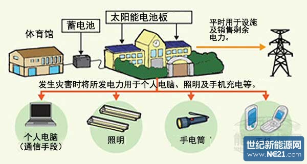 平時會將所發(fā)電力用于學(xué)校設(shè)施,或進行蓄電,同時銷售剩余電力。發(fā)生災(zāi)害時,會將所蓄積的電力供應(yīng)給個人電腦及照明裝置,或者用于手機充電等用途。另外,采用的系統(tǒng)還可在因災(zāi)害而停電時,利用蓄電池電力,自動重新啟動太陽能發(fā)電系統(tǒng)等。