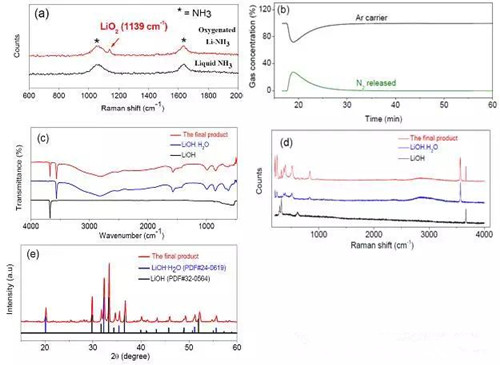 (a)液氨中合成LiO2的現(xiàn)場拉曼光譜數(shù)據(jù)(b)液氨中合成的LiO2在放置一段時間后產(chǎn)生N2的質(zhì)譜數(shù)據(jù)(c-e)液氨中LiO2最終轉(zhuǎn)變?yōu)長iOH和LiOH?H2O紅外光譜,拉曼光譜和x-射線研究結(jié)果。