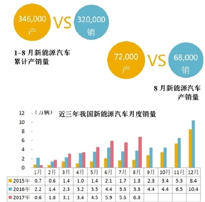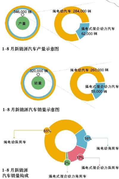 1-8月,新能源汽車產銷分別完成34.6萬輛和32.0萬輛,比上年同期分別增長33.5%和30.2%。其中純電動汽車產銷分別完成28.4萬輛和26.0萬輛,比上年同期分別增長45.4%和43.5%;插電式混合動力汽車產銷分別完成6.2萬輛和5.9萬輛,比上年同期分別下降2.6%和7.5%。