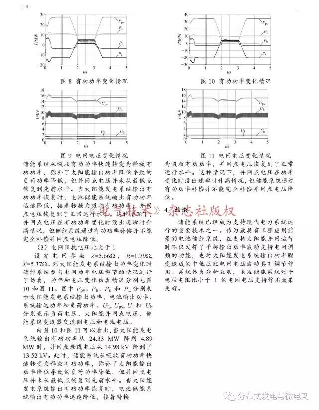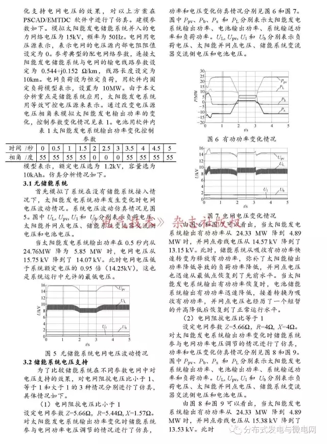 針對太陽能發(fā)電系統(tǒng)輸出功率驟變引起的電網(wǎng)電壓波動問題,設(shè)計(jì)了利用電池儲能系統(tǒng)來補(bǔ)償快速變化的有功功率的方案來實(shí)現(xiàn)對電網(wǎng)電壓的調(diào)節(jié)。對儲能系統(tǒng)在不同電抗電阻比的三種電網(wǎng)參數(shù)情況下的電壓調(diào)節(jié)功能進(jìn)行了仿真分析。