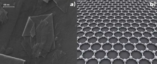 石墨烯首先于2004年[1] 被分離出來(lái),研究顯示這是一種具有單層原子厚度的雜化型的碳,圖1a所示即為單層石墨烯薄片在掃描電子顯微鏡下的觀測(cè)圖,具有碳原子形成的原子尺寸的蜂巢晶格,如圖1b所示。