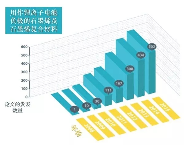 2) 指數(shù)發(fā)展期,位于2010年到2014年間,在這個(gè)時(shí)段內(nèi),大量的石墨烯與石墨烯復(fù)合負(fù)極材料被研發(fā)、測(cè)試以及觀察;