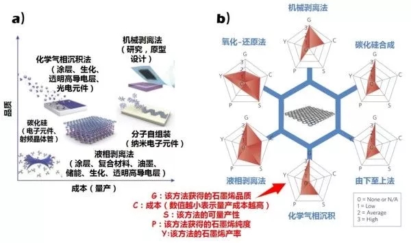 圖4 幾種常見(jiàn)的石墨烯制備方法的比較:晶體品質(zhì)VS量產(chǎn)成本(a)和五種常用評(píng)價(jià)指標(biāo)的雷達(dá)圖(b)