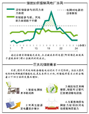 在風(fēng)電渦輪和太陽能板旁安裝儲能電站,可以幫助緩解這個矛盾。大風(fēng)天氣和陽光充沛的時段,它們可以向電網(wǎng)提供清潔并可循環(huán)利用的電能,然而到了無風(fēng)天氣和太陽下山后,需依靠可以儲存多余電能的儲能電站,來減少可再生能源的棄風(fēng)損失。