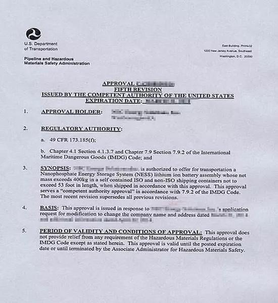目前在美國運輸此類產(chǎn)品之前,都必須獲得美國交通部(DOT)PHMSA的特別批準文件后才能進行公路、鐵路、海洋運輸。然而能夠通過并且獲得DOT的審批,需要提交復雜的文件和漫長的等待,而最終獲得過特別批準的也僅為極少數(shù)的美國知名制造商。