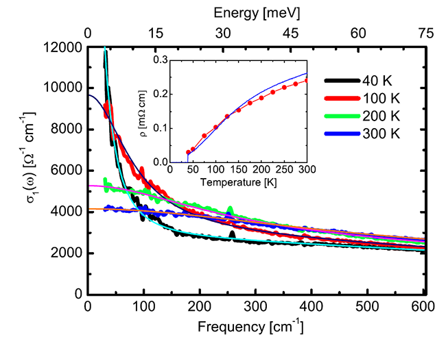 圖2 光電導(dǎo)曲線可以分解為一個(gè)寬的Drude, 一個(gè)窄的Drude (分別代表兩種具有不同散射率的載流子), 和Lorentz項(xiàng) (表示帶間躍遷)。