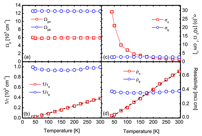 圖3 兩個(gè)Drude的溫度依賴。(b)和(d)兩個(gè)面板分別是散射率和等效電阻對(duì)溫度的依賴關(guān)系,其中的兩條黑色虛線是線性擬合的結(jié)果。