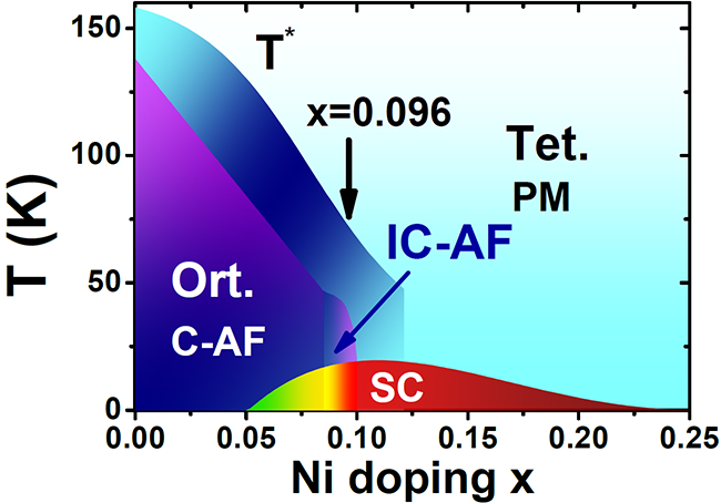 圖1. BaFe2-xNixAs2電子態(tài)相圖,其中T*為平面內(nèi)電阻各向異性消失溫度,箭頭所指為測(cè)量樣品摻雜點(diǎn)。