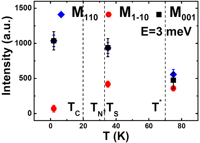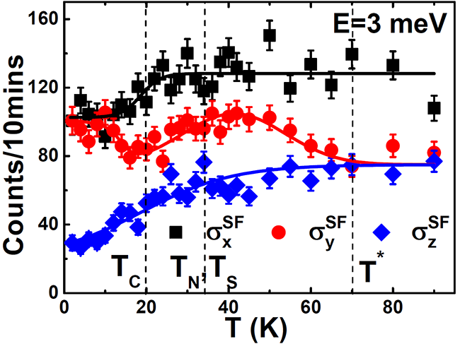 圖3. E=3meV處自旋激發(fā)的各向異性一直持續(xù)到遠(yuǎn)高于TN和Ts的T*溫度,并在Tc以下的超導(dǎo)態(tài)增強(qiáng)。