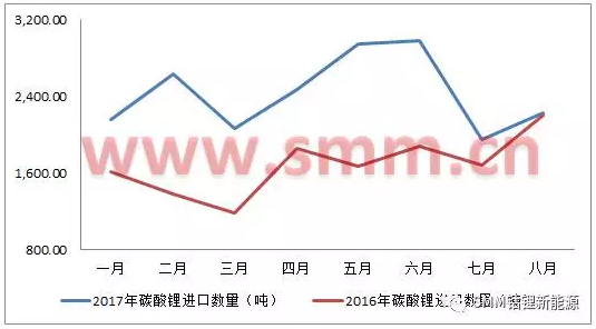圖一:2016/2017年1-8月碳酸鋰進(jìn)口數(shù)量趨勢圖(來源:海關(guān)信息網(wǎng),SMM)