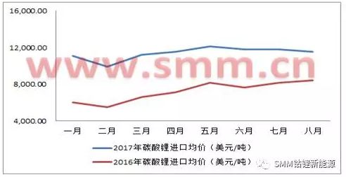 圖二:2016/2017年1-8月碳酸鋰進(jìn)口均價趨勢圖(來源:海關(guān)信息網(wǎng),SMM)