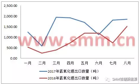 圖三:2016/2017年1-8月氫氧化鋰進(jìn)口數(shù)量趨勢圖(來源:海關(guān)信息網(wǎng),SMM)
