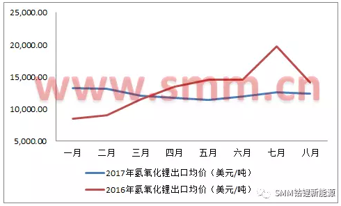 圖四:2016/2017年1-8月氫氧化鋰進(jìn)口均價趨勢圖(來源:海關(guān)信息網(wǎng),SMM)