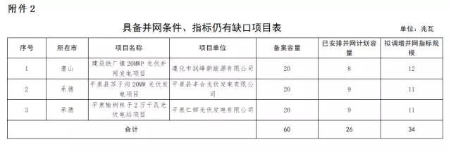 二、6月30日前,具備并網(wǎng)條件,但因冀北暫停并網(wǎng)原因未并網(wǎng)、仍有指標(biāo)缺口的項(xiàng)目,予以補(bǔ)齊缺口。涉及項(xiàng)目3個(gè)、34兆瓦(附表2)。
