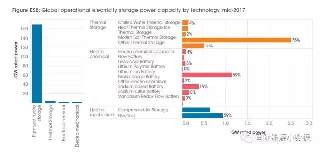 中國儲能網(wǎng)訊:根據(jù)國際可再生能源署(IRENA)日前發(fā)布“電力儲存與可再生能源——2030年的成本與市場”報(bào)告,到2017年中全球儲能裝機(jī)容量為176吉瓦,其中169吉瓦抽水蓄能(占96%);3.3吉瓦熱能儲存(1.9%);1.9吉瓦電池儲能(1.1%);1.6吉瓦機(jī)械儲能(0.9%)。