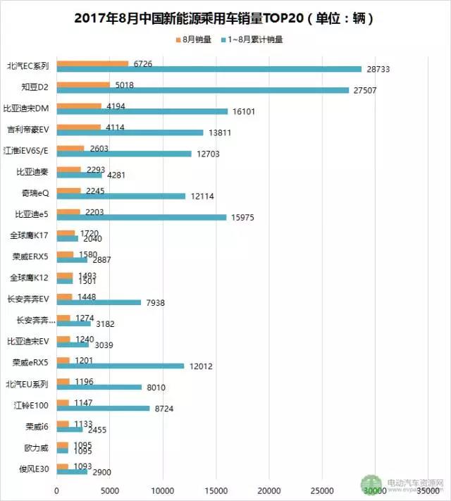 2017年8月中國(guó)新能源乘用車銷量排行中,北汽EC系列奪得了冠軍,8月銷售6726臺(tái);知豆D2銷售了5018臺(tái),排在第二位;排在第三的是比亞迪宋DM,8月銷售4194臺(tái)。