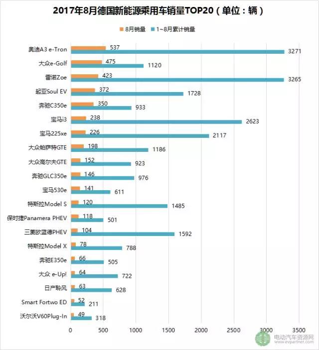 從8月月度銷量排名來看,8月銷量為537臺(tái)的奧迪A3 e-Tron奪得月度銷量冠軍;大眾e-Golf排在了第二位,8月銷售了475臺(tái);雷諾Zoe銷售了423臺(tái),排在第三位。