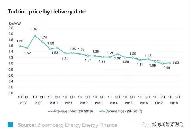 風(fēng)機(jī)造價(jià)從2009年上半年的每兆瓦194萬美元跌至2017年下半年的每兆瓦99萬美元,下降了49%。而風(fēng)機(jī)發(fā)電平準(zhǔn)價(jià)格則從2009上半年的每兆瓦時(shí)914美元/年降至2017下半年的每兆瓦時(shí)300美元/年,下降了68.2%。