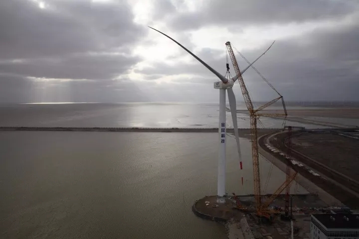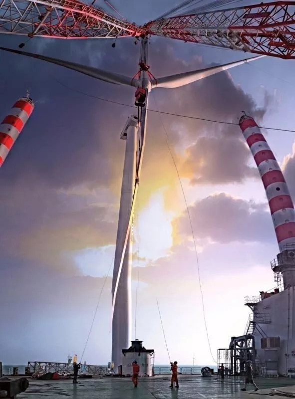 ↑ 2015年,江蘇大豐港,金風(fēng)科技首臺6MW海上樣機(jī)成功吊裝。2016年7月實(shí)現(xiàn)滿發(fā)后,始終保持良好的運(yùn)行狀況