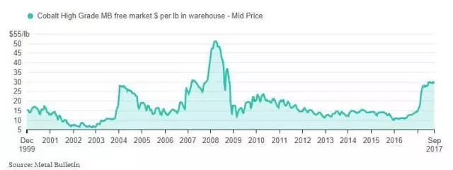 在2016年,全球金屬報(bào)價(jià)中鈷的價(jià)格從每磅10.30美元上漲了接近一半的價(jià)格,達(dá)到每磅14.70美元,從這以后鈷價(jià)格又上漲到每磅29.85美元,約為每噸65,808美元。