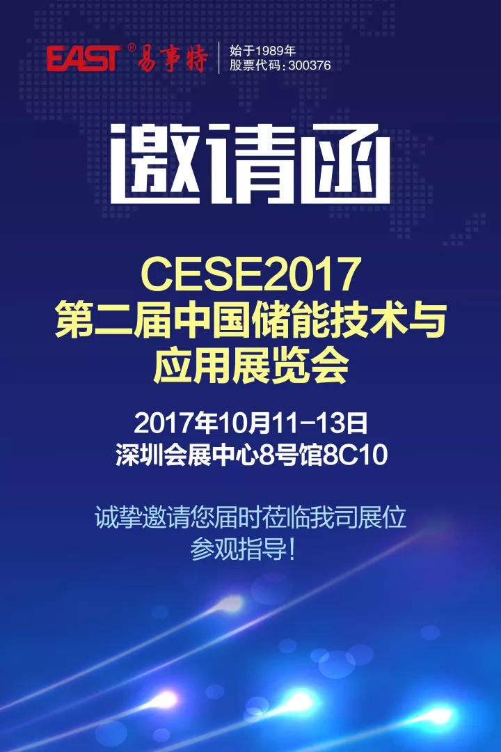CESE2017第二屆中國儲能技術與應用展覽會,精彩紛呈。易事特將為您呈現(xiàn)智能環(huán)保、高效可靠的儲能及智能微電網(wǎng)系統(tǒng)解決方案。誠摯邀請您撥冗蒞臨易事特展位交流洽談。