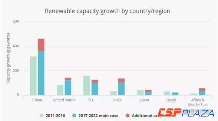 過去對于可再生能源發(fā)展規(guī)模預(yù)測曾經(jīng)偏保守的IEA現(xiàn)在預(yù)測,2017-2022年間全球可再生能源新增裝機將至少達到920吉瓦(其中風(fēng)電321吉瓦、光伏438吉瓦),其中363吉瓦(39%)將來自中國。如果各國政策支持力度加大的樂觀情形下,2017-2022年間可再生能源新增裝機可能達到1150吉瓦,其中464吉瓦(40%)來自中國。