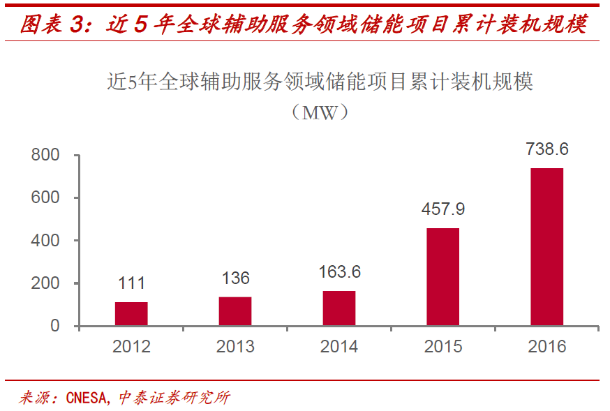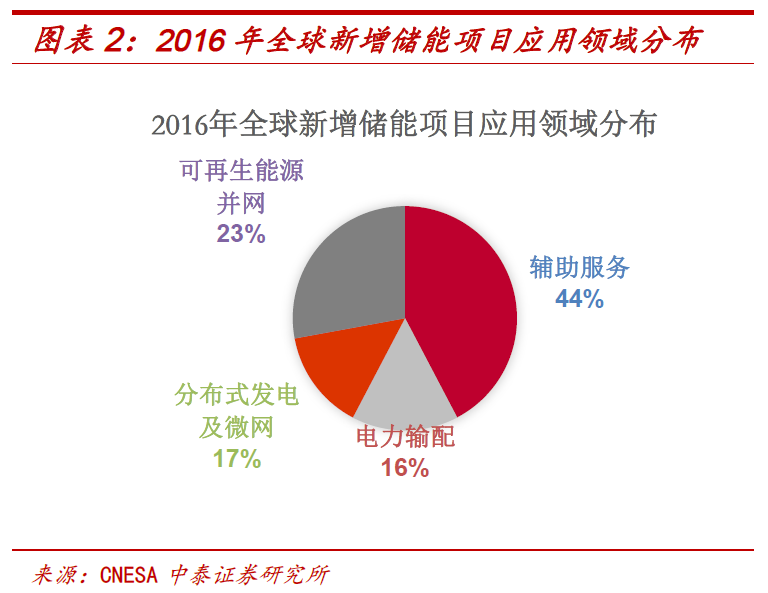 全球2016年新增裝機(jī)在應(yīng)用分布上,輔助服務(wù)44%,可再生能源并網(wǎng)23%,分布式發(fā)電及微網(wǎng)17%,電力輸配16%。當(dāng)前我國(guó)儲(chǔ)能的應(yīng)用結(jié)構(gòu),主要以用戶側(cè)為主,包括削峰填谷、IDC數(shù)據(jù)中心等應(yīng)用,2016年我國(guó)基于用戶側(cè)的投運(yùn)儲(chǔ)能系統(tǒng)裝機(jī)量107.9MW(不含抽水儲(chǔ)能和儲(chǔ)熱項(xiàng)目),占全部裝機(jī)比例57%,發(fā)電側(cè)可再生能源并網(wǎng)33%,電力輔助市場(chǎng)占比約為10%。
