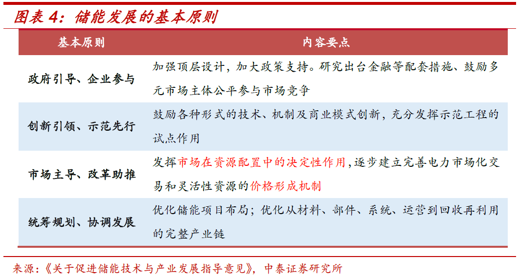 這次指導(dǎo)意見(jiàn)提出了儲(chǔ)能發(fā)展的四項(xiàng)基本原則:1)政府引導(dǎo)、企業(yè)參與;2)創(chuàng)新引領(lǐng)、示范先行;3)市場(chǎng)主導(dǎo)、改革助推;4)統(tǒng)籌規(guī)劃、協(xié)調(diào)發(fā)展。