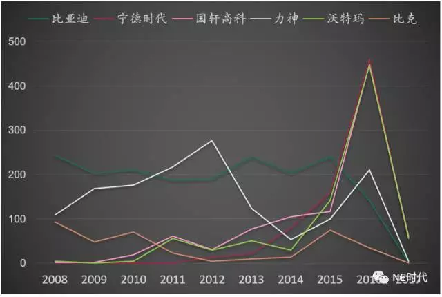 天津力神在2012年之前在專利申報(bào)方面一直處于領(lǐng)先地位,但是2012年后進(jìn)入快速下降同道。直到2016年贏來了一個(gè)小高峰,可能是加大了汽車電池的研發(fā)投入。